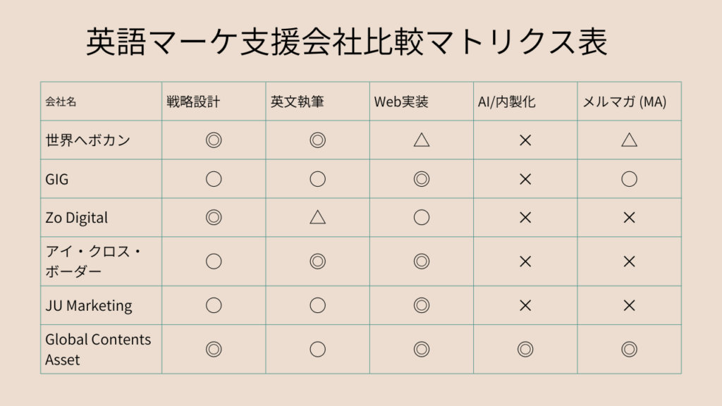 1, 日本発・英語Webマーケティング支援5社の特徴比較
