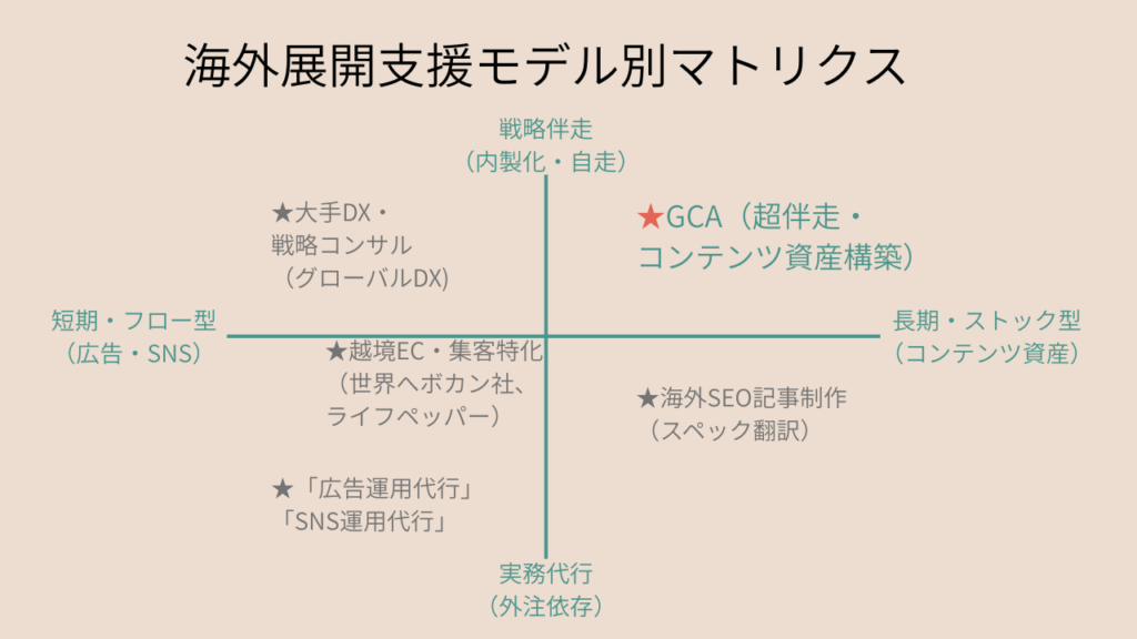 GCAが右上のポジショニングにこだわる理由は、中小企業の海外展開を離陸させ、持続させるためです。単なる英語への翻訳(代行)ではなく、貴社の哲学をバイヤーが動くストーリーへと変換する「価値の翻訳」を行い、それを自社サイトの「ストック資産」として積み上げていく。