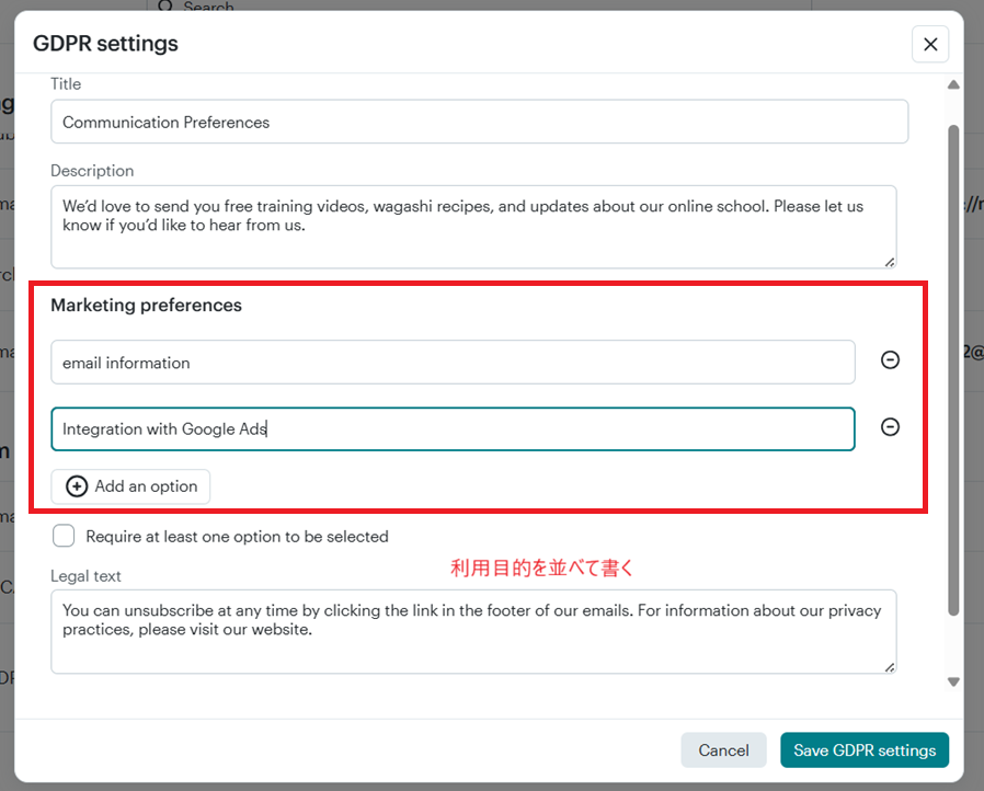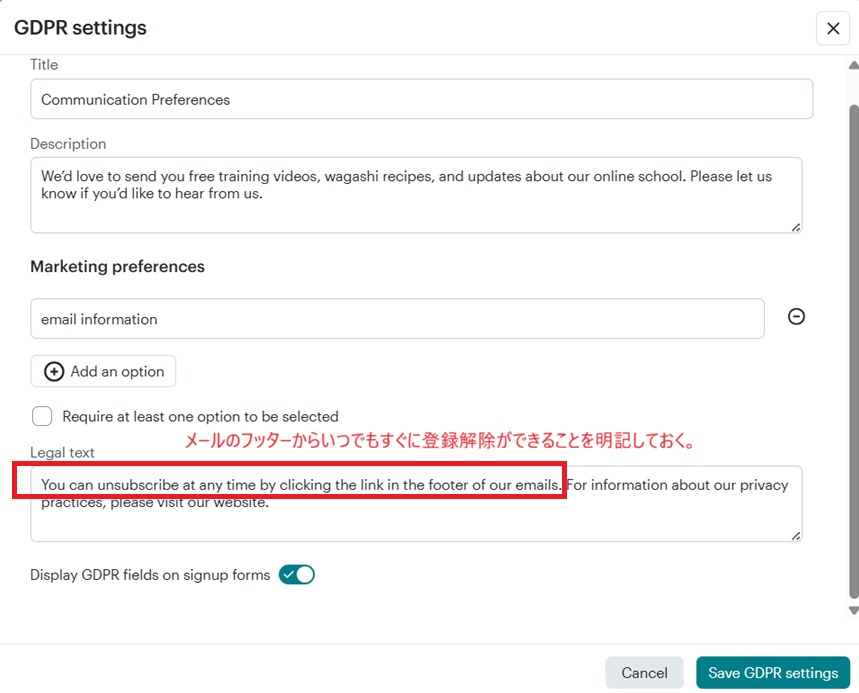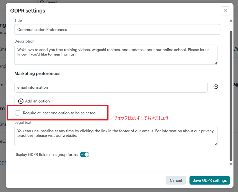 なぜ必要か: GDPRでは「能動的な同意」が求められます。Mailchimpは標準で「最初からチェックが入っている状態(プリチェック)」を禁止する仕様になっているので安心ですが、私たちが気をつけたいのは「同意の強制」です。