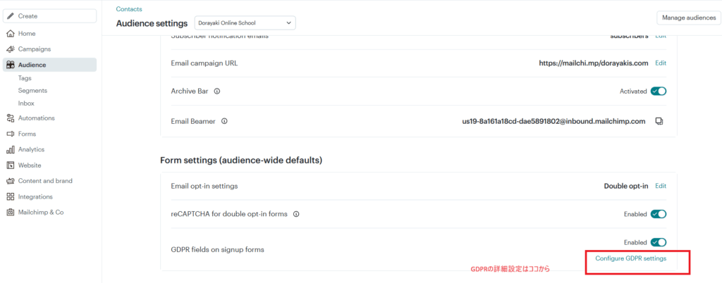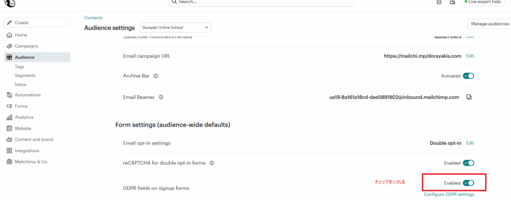 まずは、Audienceの設定から「GDPR fields」を有効にしましょう。