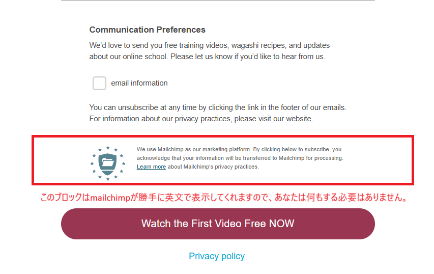 フォームを設置すると、下部に星のアイコンと共に「We use Mailchimp as our marketing platform…」という英文が自動で表示されます。実はこれ、現時点では他言語への変更ができない仕組みなのですが、そのまま活用しましょう。