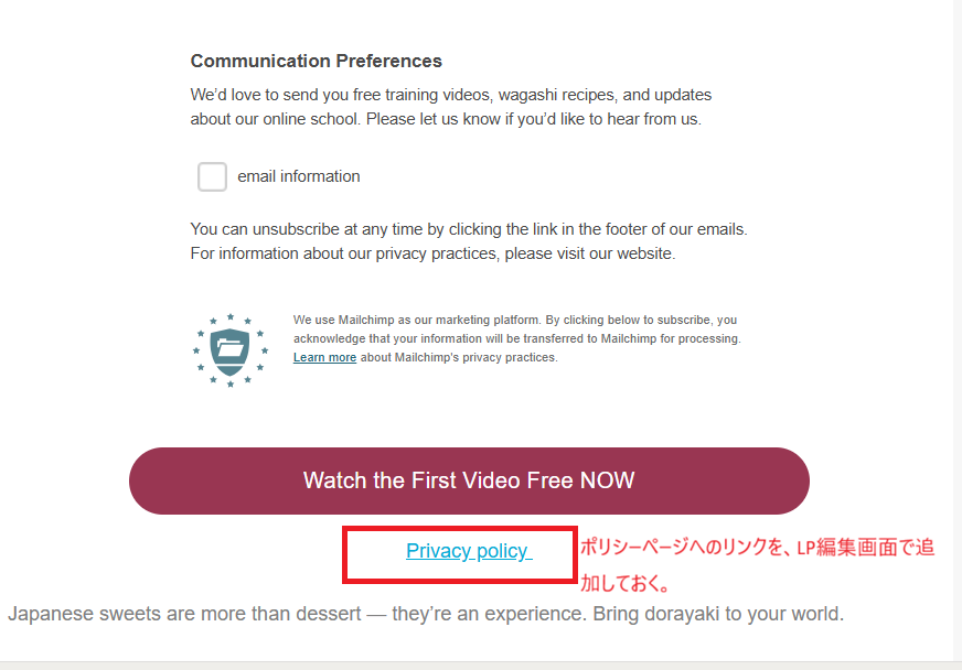 そして、プラス、メールアドレスを収集する画面制作のページで、編集作業にて、フォームのすぐそばにプライバシーポリシーページへのリンクを貼っておきましょう。