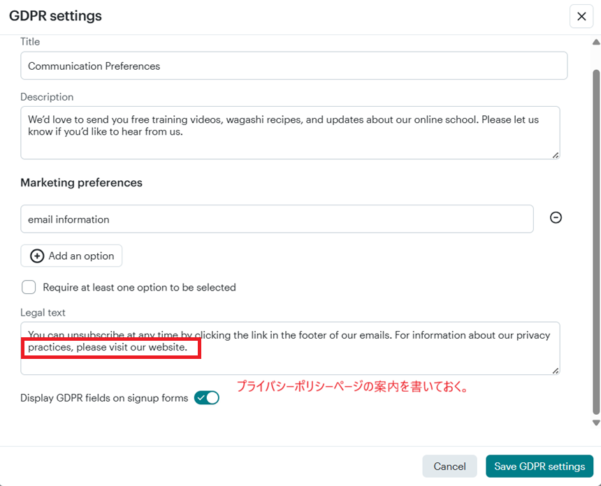 GDPR詳細設定画面のなかで、最新のプライバシーポリシーへのリンクを観るように促す文言をいれておきます。